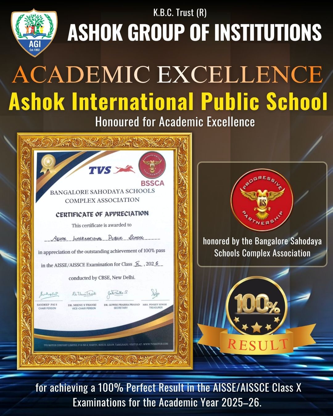 We are proud to announce that Ashok International Public School has been awarded by the Bangalore Sahodaya Schools Complex Association for achieving a 100% Perfect Result in the AISSE/AISSCE Class X Examinations for the Academic Year 2025–26