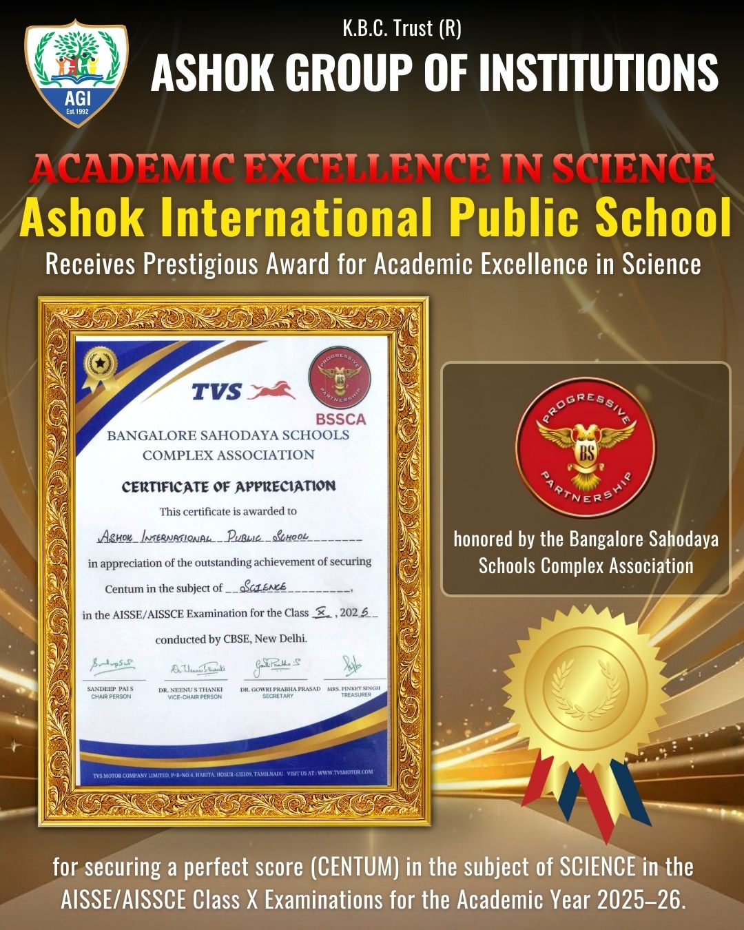 We are delighted to share that Ashok International Public School has been honored by the Bangalore Sahodaya Schools Complex Association for securing a perfect score (CENTUM) in the subject of SCIENCE in the AISSE/AISSCE Class X Examinations for the Academic Year 2025–26.