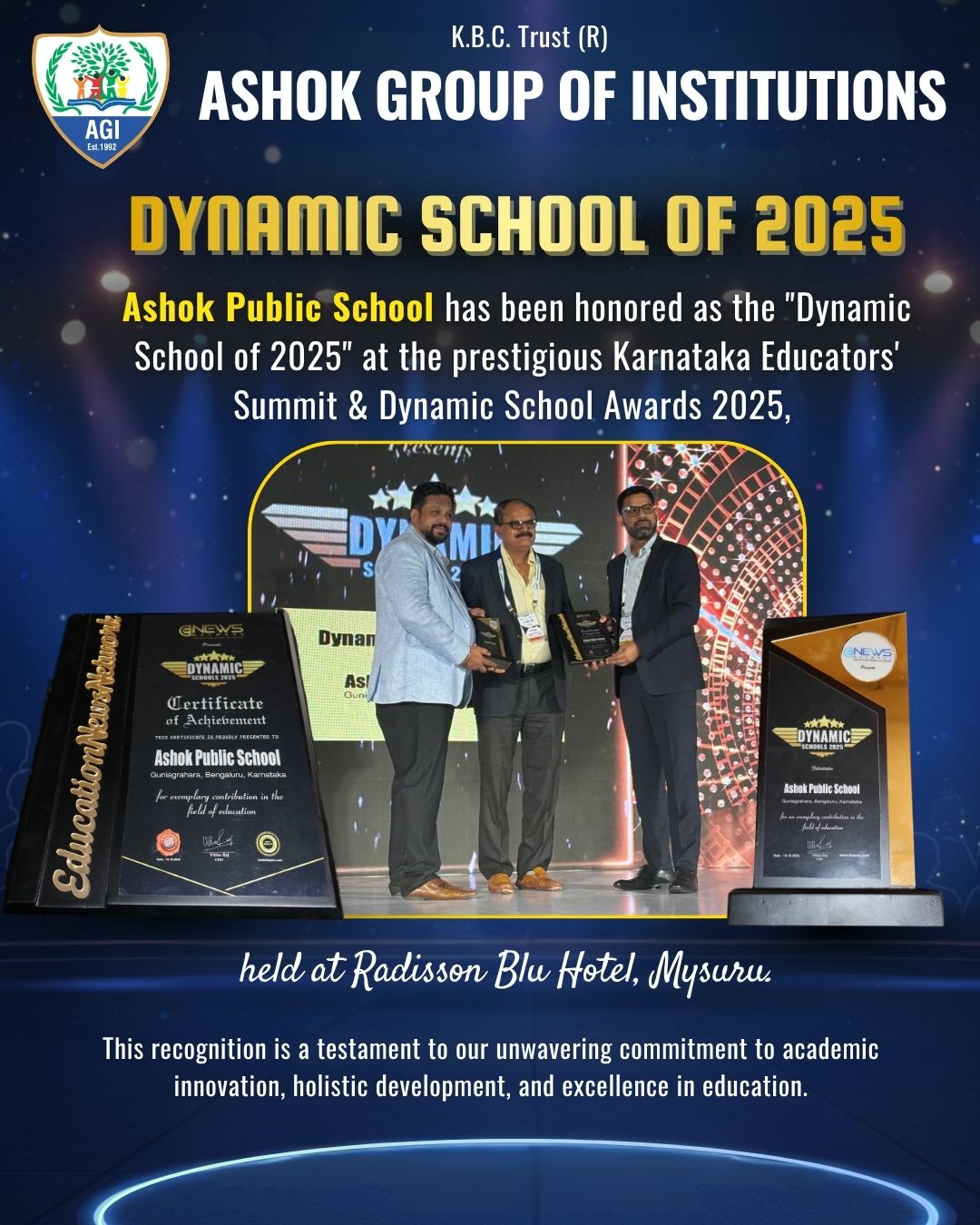 Ashok Public School has been honored as the "Dynamic School of 2025" at the prestigious Karnataka Educators' Summit & Dynamic School Awards 2025, This recognition is a testament to our unwavering commitment to academic innovation, holistic development, and excellence in education.