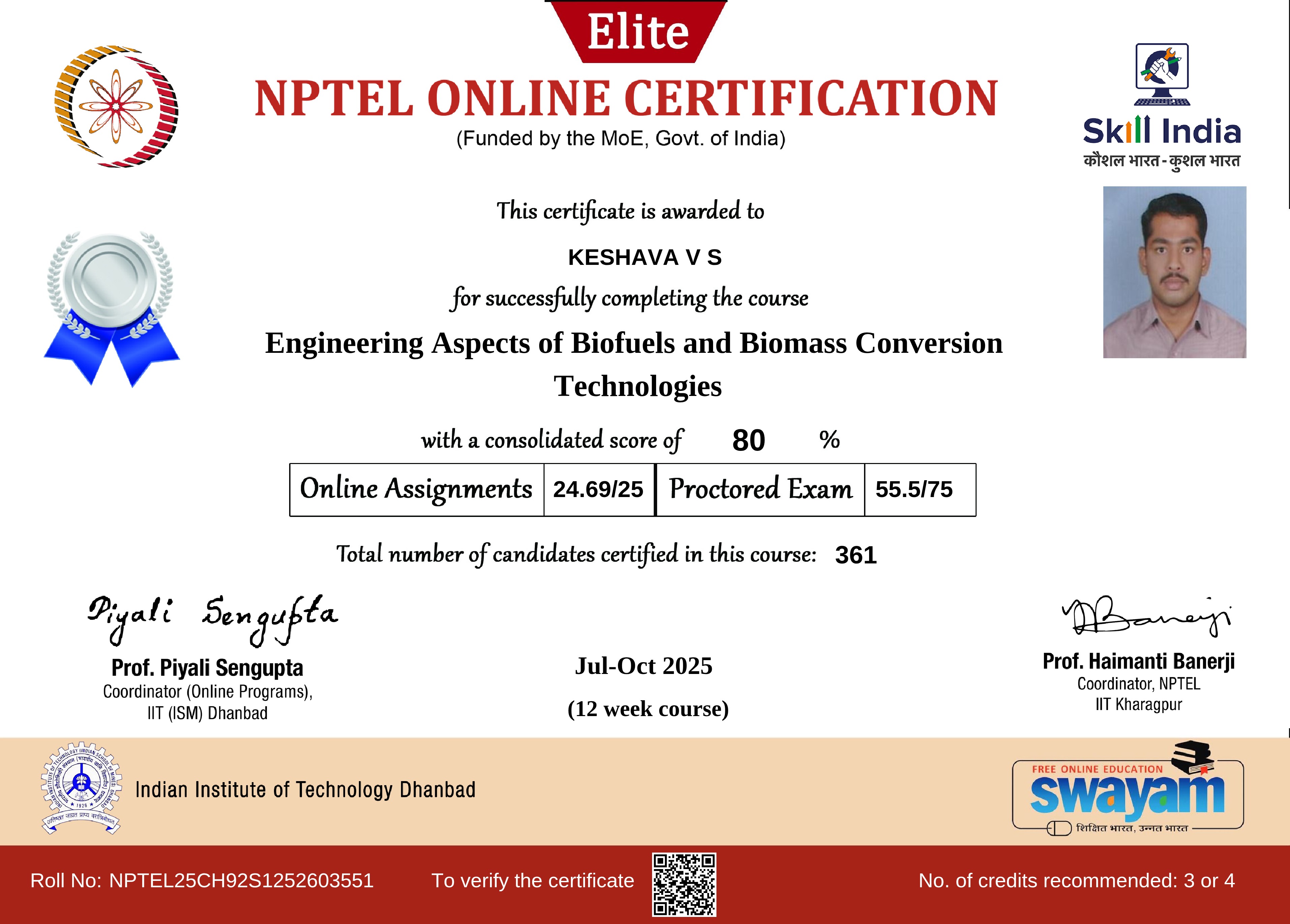Engineering Aspects of Biofuels and Biomass Conversion Technologies, gaining knowledge on thermochemical and biochemical conversion processes, reactor design, and sustainable biofuel production technologies NPTEL certificate 2025-2026.”